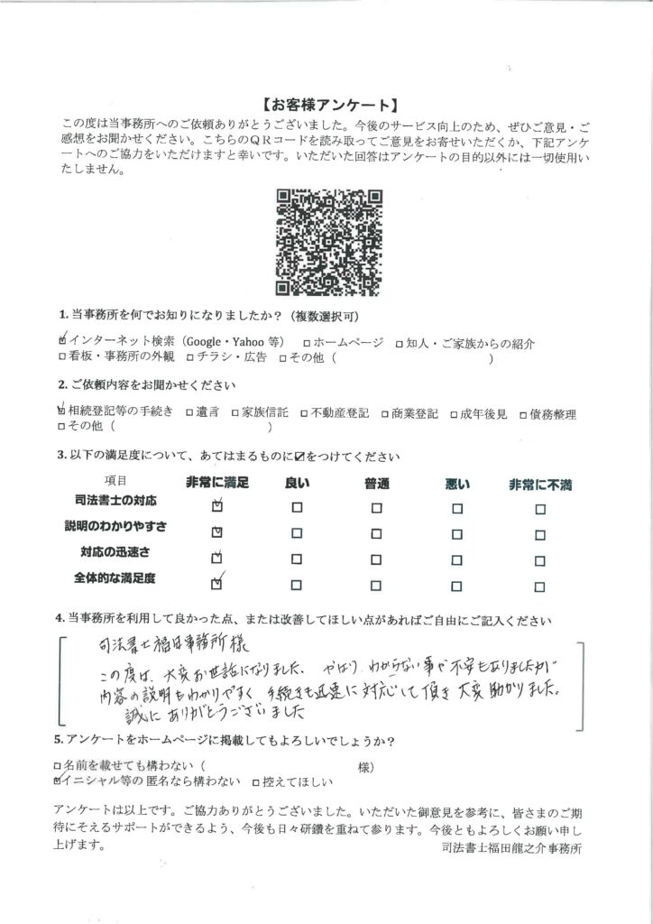 この度は、大変お世話になりました。やはり、わからない事や不安もありましたが、内容の説明もわかりやすく手続きも迅速に対応して頂き大変助かりました。
